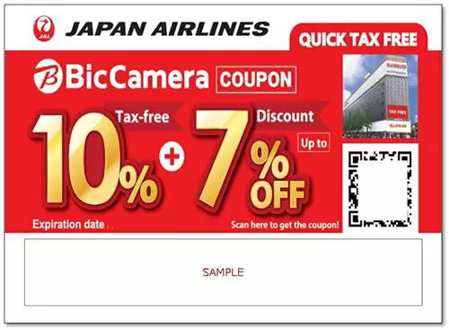 期間限定で配布されている免税優待券を、ビックカメラグループの店舗にて免税で買い物をする際にレジで提示することで、対象商品が最大7%引き(日用品・お菓子などは5%引き、お酒は3%引き)になる。なお、この免税優待券は、一時帰国の日本人も免税で買い物をする際に使える。