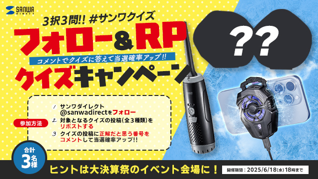 あわせて、「サンワダイレクト」の歴史に関するクイズをリポストした人の中から、抽選で1名・計3名に賞品をプレゼントする「フォロー&RPクイズキャンペーン」が、6月18日18時まで同店の公式Xアカウント(@sanwadirect)にて開催されている。