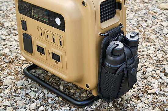 底面から背面にフレーム型スタンドを設けることで、電源部を浮かせて設置可能なため、水濡れや砂、凹凸などの影響を最小限に抑えられる。背面には持ち運び用のバーハンドルを備えており、不意のアクシデントによって転倒してしまった際には、プロテクターとして本体を保護する。また、吸排気口には取り外しできるメッシュパーツを備えているので、枯れ草などの侵入も防げる。