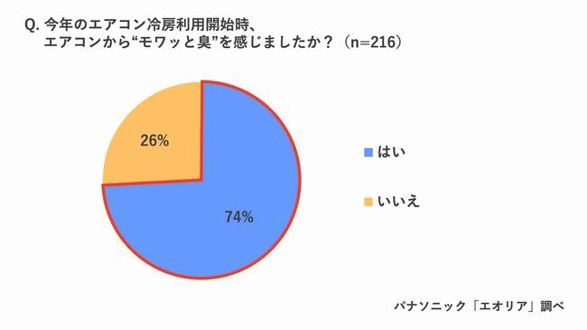 今年すでにエアコンでの冷房利用を開始している人に、今年のエアコンでの冷房利用開始時にエアコンから「モワッと臭」を感じたかを尋ねた質問では、「感じた」とする回答が74%に達している。