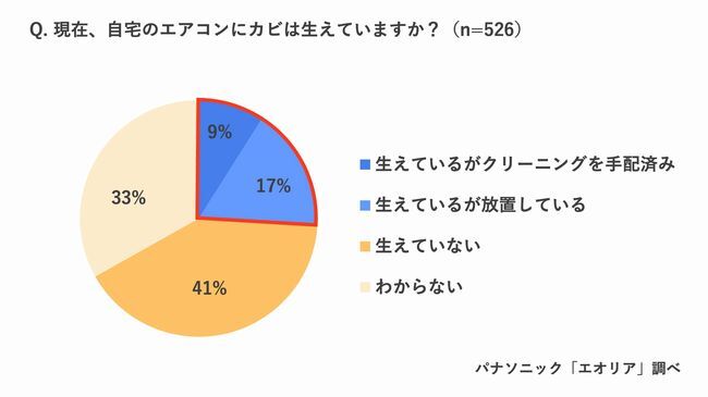 現在、自宅のエアコンにカビが生えているかを尋ねたところ、「生えているがクリーニングを手配済み」(9%)と「生えているが放置している」(17%)を合わせた26%が、カビの発生を把握していることがわかった。一方で、「わからない」という回答も33%に達している。