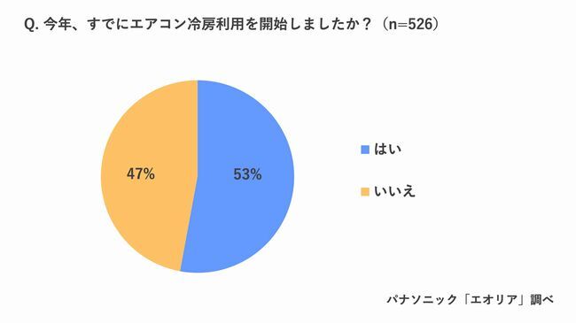 調査対象者に、今年(2025年)すでにエアコンの冷房利用を開始したかを尋ねたところ、「すでに利用を開始している」とする回答が53%、「まだ利用を開始していない」とする回答が47%だった。