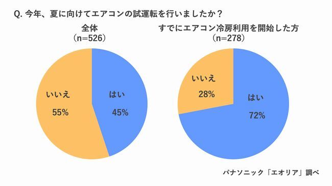 夏に向けて、エアコンの試運転を行ったかを尋ねた質問では、「試運転を行った」とする回答は45%となった一方、すでにエアコンでの冷房利用を開始している人では、「試運転を行っていない」とする回答が28%に達している。
