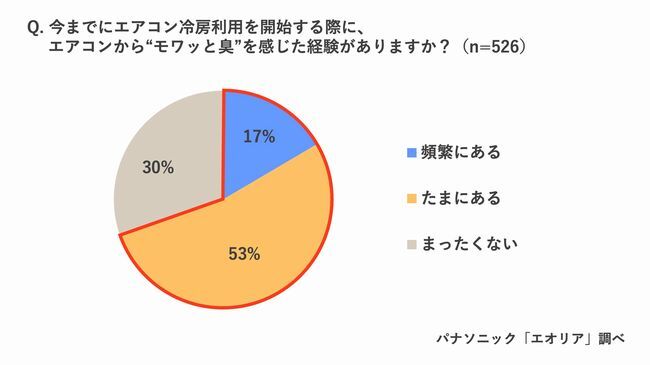 今までに、エアコンでの冷房利用を開始する際に、エアコンから「モワッと臭」を感じた経験があるかを尋ねたところ、「頻繁にある」(17%)と「たまにある」(53%)を合わせた割合が70%を占めた。