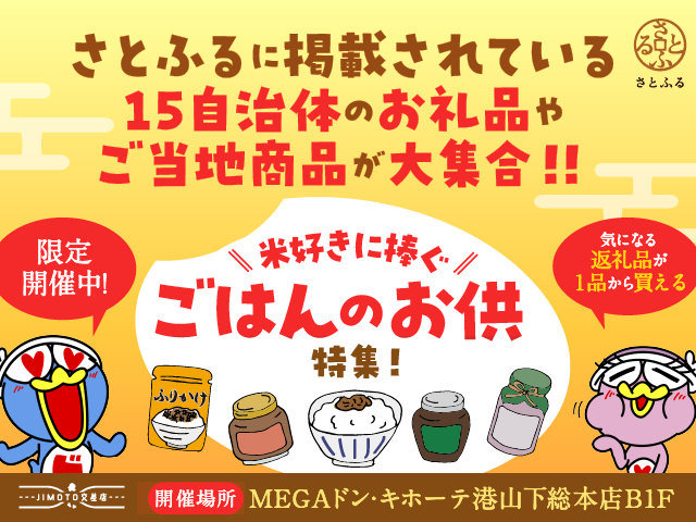 さとふるとカイバラボは6月18日~9月1日の期間、日本全国の豊富なふるさと納税のお礼品をその場で見て購入できる、「JIMOTO交差店×さとふる」をMEGAドン・キホーテ(ドンキ) 港山下総本店(神奈川県横浜市)で開催している。