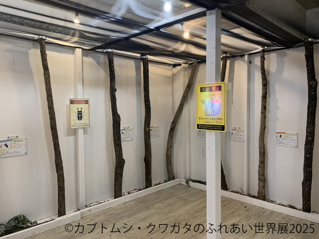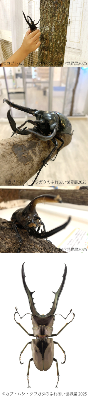 「カブトムシ・クワガタのふれあい世界展 2025」では、会場内に本物の木を使用した特設スペースを設置することによって、まるで自然の中にいるかのような空間で子どもたちに大人気のカブトムシやノコギリクワガタをはじめ、虹色に輝く「世界一美しいクワガタ」とも称されるニジイロクワガタ、迫力満点の外国産カブトムシであるコーカサスオオカブト、サタンオオカブト、ヘラクレスオオカブトといった、貴重な昆虫たちとのふれあい体験を楽しめる。