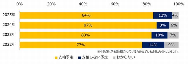 調査対象者に、2025年の夏季賞与を支給する予定かを尋ねたところ、「支給予定」は前年の調査と比較して3ポイント減の84%だった。一方、「支給しない予定」は12%で、前年調査より4ポイント増加している。