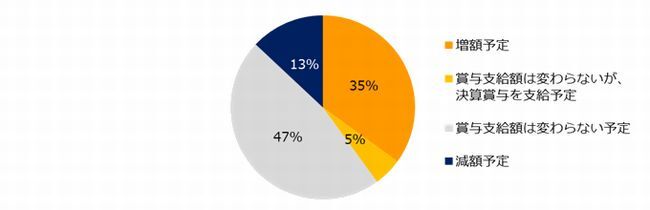 夏季賞与を「支給予定」と答えた企業に、前年の夏季賞与と比較して、支給額に変動があるかを尋ねた質問では、「賞与支給額は変わらない予定」(47%)がもっとも多く、「増額予定」は35%となっている。