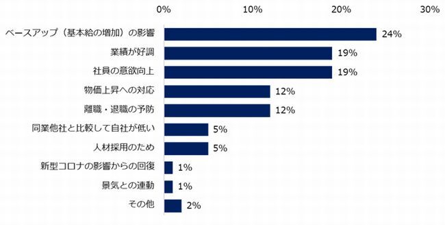 同じく、2025年の夏季賞与を前年と比較して「増額予定」と答えた企業に、夏季賞与を増額する理由を尋ねた質問(複数回答)では、「ベースアップ(基本給の増加)の影響」(24%)がもっとも多い。