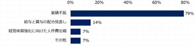 同じく、夏季賞与を「減額予定」と答えた企業に、減額する理由を尋ねた質問(複数回答)では、「業績不振」(79%)がもっとも多い。