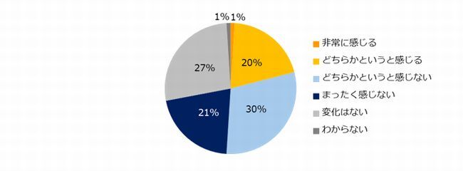 前年と比較して、景気の上昇や回復を実感できているかを尋ねた質問では、「非常に感じる」(1%)と「どちらかというと感じる」(20%)を合わせた割合が21%に留まり、前年調査と比較して8ポイント減となった。