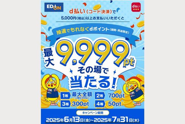 • エディオン、「d払い」で「その場で最大9999ポイント」還元のキャンペーン開催中!