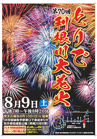 今年で70回目となる、茨城県取手市の夏の風物詩「とりで利根川大花火」が8月9日に開催される。打ち上げる花火の数は約1万発で、好評のドローンショーを今年も実施する。