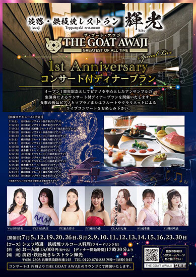 淡路・鉄板焼レストラン“輝光”にて、7月・8月の土曜日・休前日と8月10~15日限定で提供される、オープン1周年記念コンサート付きディナープランは、ディナーとともにピアノを中心としたアンサンブルの生演奏によるコンサートを楽しめる。コースは、シェフ特選 鉄板焼フルコース料理(フリードリンク付き)で、税・サービス料込みの料金は1万5000円。17時30分からの開催となる。