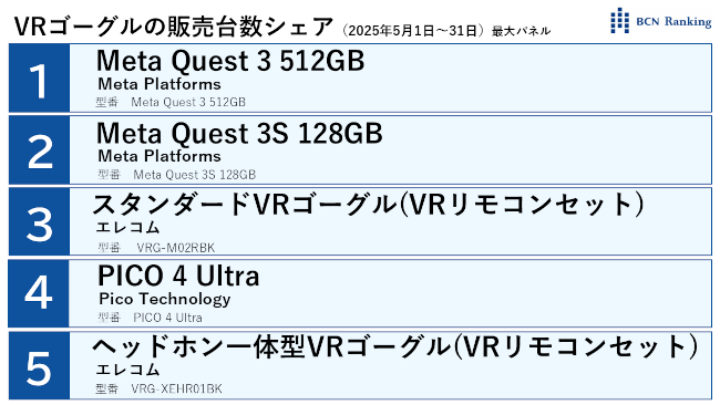 ちなみに、いろんなVRゴーグルが花盛りですが、どれを選べばいいのでしょうか。家電量販店とネットショップの実売データを収集しているBCNランキングによる「VR・ARゴーグル」の5月の月次データでは、1位がMeta Platformsの「Meta Quest 3 512GB」、2位もMeta Platformsの「Meta Quest 3S 128GB」、3位はエレコムの「VRG-M02RBK」が人気のモデルです。購入する際の参考にしてください。