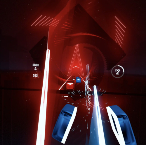 確かに、前方から飛んでくるキューブをライトセーバーのような光線剣で切るだけのシンプルなゲームですが、切る方向が指示されているので、上から下に、右から左に、下から上にとランダムに変わる方向指示に素早く反応して光線剣を動かさなくてはいけません。