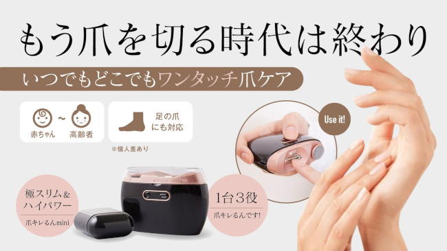 また、爪切りだけでなく、研磨、皮・角質のケアもこなす多機能なところも売りだ。コンパクトかつ長時間バッテリー(最大連続使用時間は240分)なので、持ち歩きもしやすい。より小型のminiモデルも用意しているので、ポーチに入れておきたいというニーズにも応えてくれる。