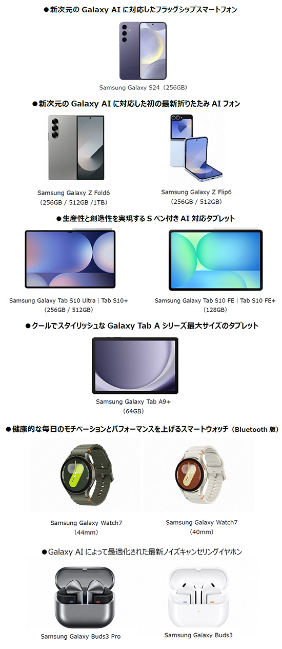 今回の「Amazonプライムデー先行セール」および「Amazonプライムデー」では、「Samsung Galaxy S24」シリーズや「Samsung Galaxy Z Fold6」「Samsung Galaxy Z Flip6」をはじめとするスマートフォン・スマートウォッチ・ワイヤレスイヤホン・タブレット端末向けアクセサリーといった、幅広い製品をセール価格で購入できる。また、2025年に発売されたばかりの「Samsung Galaxy Tab S10 FE」もセール対象製品に含まれる。