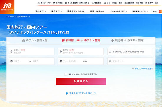 JTBの「ダイナミックパッケージ」は、JR・新幹線と飛行機、宿泊施設をセットで予約できるホテルパックです。さまざまな種類のホテルが用意されていて、目的に合わせて選択できます。