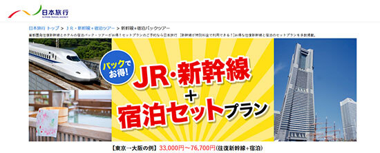 「JR・新幹線+宿泊セットプラン」は、日本旅行の提供するホテルパックです。往復新幹線と宿泊施設を割引料金で利用できます。