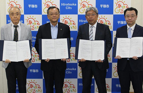 平塚市役所で行われた締結式の様子 (左から)