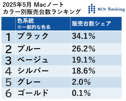 BCNランキングの2025年5月の月次集計によると、Macノートのカラー別(色系統別)販売台数1位はブラック、2位はブルー(スカイブルー)、僅差の3位・4位はベージュ(スターライト)とシルバーでした。(BCN・嵯峨野 芙美)