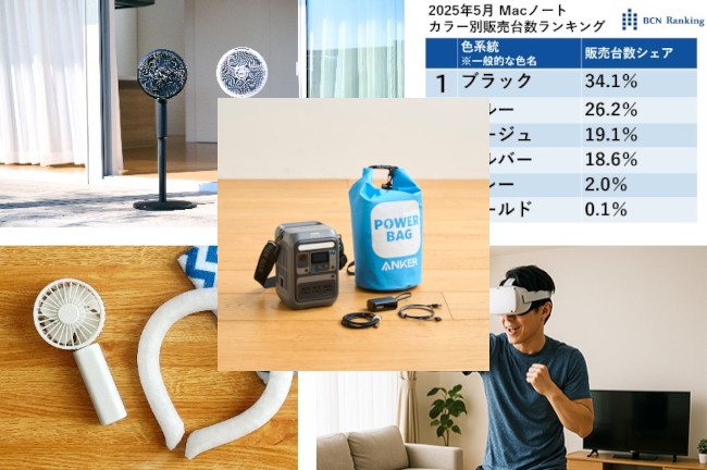 【6月27日~7月4日の特集ダイジェスト】 「BCN+R」では、時期ごとにテーマを決めて特集として取り上げています。今回のテーマは「暑さ対策」「防災」など。6月27日~7月4日の期間、「猛暑対策家電」「夏ダイエット」「デジタル涼感グッズ」を切り口に暑さ対策の方法、「防災用電源」を切り口に災害時に役立つ電源の選び方を紹介しました。また、全国の主要家電量販店・ネットショップから実売データを収集している「BCNランキング」をもとに、ノート型Mac(Macノート)のカラー別販売台数シェアも分析しました。ここでは、それぞれの記事を少しだけ、お見せしますね。
