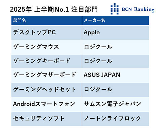 BCNは7月17日、デジタル家電の実売データを集計する「BCNランキング」に基づき、「BCN AWARD 2026」中間発表として、主要105部門(ハードウェア90、ソフトウェア15)において2025年上半期(1月-6月)に最も販売数が多かった「上半期No.1メーカー」を発表した。
