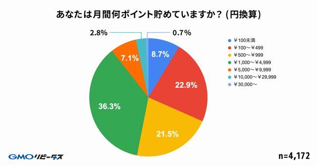 同じく、「意識してポイントを貯めている」と答えた人に、月間でどのくらいポイントを貯めているかを尋ねたところ、「1000円~4999円」(36.3%)が最も多く、1000円以上貯めている人は46.9%を占めた。中でも、5000円以上貯めている人は10.6%に達している。一方で、「100円~499円」(22.9%)と「500円~999円」(21.5%)を合わせた割合が44.4%を占めた。