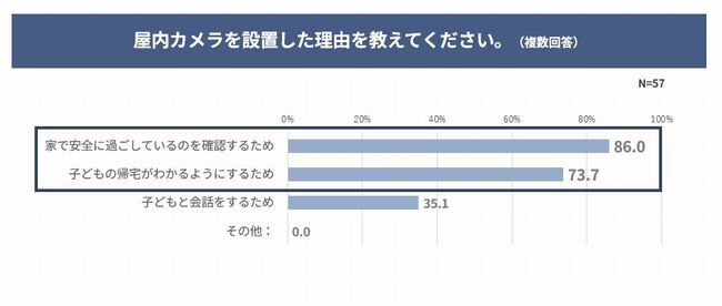 子どもだけで留守番をしている際の、様子の確認手段として「屋内カメラを設置」していると答えた人に、屋内カメラを設置した理由を尋ねたところ(複数回答)、「家で安全に過ごしているのを確認するため」(86.0%)がもっとも多く、「子どもの帰宅がわかるようにするため」(73.7%)がそれに続いた。