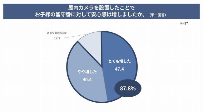 屋内カメラを設置したことで、子どもだけの留守番に対して安心感が増したかを尋ねた質問では、「とても増した」と「やや増した」を合わせた割合が87.7%に達している。