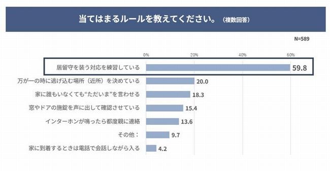 各家庭で設けている、小学生の子どもだけで留守番をする際の防犯ルールとしては(複数回答)、「居留守を装う対応を練習している」(59.8%)がもっとも多く、以下「万が一の時に逃げ込む場所(近所)を決めている」(20.0%)、「家に誰もいなくても“ただいま”を言わせる」(18.3%)が続いている。