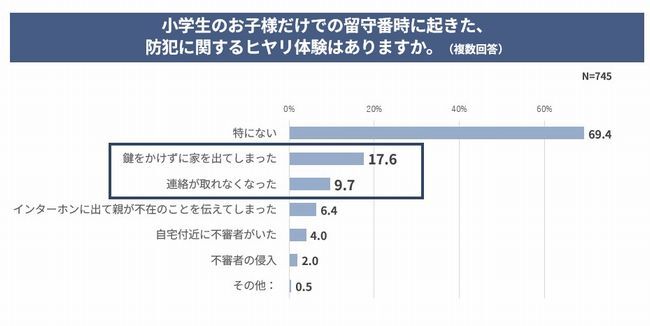 小学生の子どもが1人で留守番をしている際の「ヒヤリ体験」について尋ねた質問(複数回答)では、「特にない」(69.4%)が最多となった一方で、「鍵をかけずに家を出てしまった」(17.6%)、「連絡が取れなくなった」(9.7%)、「インターホンに出て親が不在と伝えてしまった」(6.4%)といった回答も寄せられた。また、少数ながら「不審者の侵入」という深刻な事態を体験している家庭もあったという。