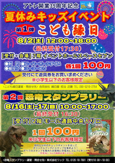 アトレ川越(埼玉県川越市)では、親子そろって楽しめるキッズイベントの第1弾として8月2日に「こども縁日」を、第2弾として8月16日・17日に「恐竜スタンプラリー」を開催する。