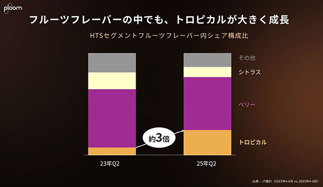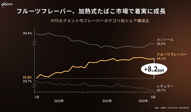 また、加熱式たばこの利用者で3割以上が「フルーツフレーバー」を選択。2023年1月から25年5月までのデータでは、HTS(Heated Tobacco Sticks)セグメントでフルーツフレーバーのカテゴリーシェアが、約25%から34.1%へと8.2ポイント増加したという。