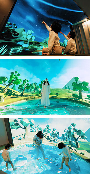 四季や昼・夕方・夜の移ろいを感じられる映像によって、子どもだけでなく大人も心地よく楽しめる空間となっている。