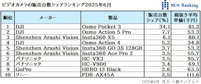 DJIのビデオカメラ「OSMO POCKET 3」(オズポケ3)の大躍進が止まらない。登場したのは2023年10月25日。発売からわずか7日で10月の月次販売台数シェア11.3%を記録。いきなり販売台数ランキング3位で登場したのには驚いた。そして翌11月には26.8%で悠々と1位を奪取。以降この6月まで、20カ月連続でトップを走り続けている。まさにメガヒットのビデオカメラだ。発売から丸2年近く経過しているものの勢いは衰えない。足元ではさらにシェアが上昇。この6月の販売台数シェアは34.1%と過去最高を記録した。全国2300店舗の家電量販店やオンラインショップの実売データを集計する、BCNランキングで明らかになった。