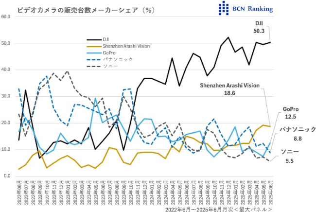 オズポケ3の販売台数シェアは23年11月以降、一度も20%を割り込んだことがない。さらに、ここにきて勢いづいており、5月には33.8%、6月には34.1%と2カ月連続で過去最高シェアを更新した。メーカー別でも同様だ。オズポケ3を世に送り出したDJIは23年11月、33.0%のシェアを獲得。一気にトップシェアに上り詰めた。その後、勢いを増しながらダントツを維持している。この6月は50.3%と過半を占める独走。まさにDJI無双、オズポケ3無双の状態だ。オズポケ3の登場でビデオカメラ市場も一気に活気づいた。それまで前年並みから前年割れの水準で低迷していたが、23年10月以降21カ月連続で前年超えを継続。市場全体を押し上げている。
