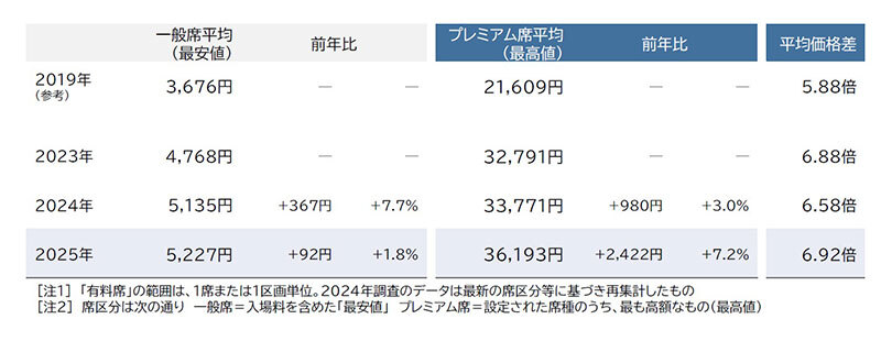 有料席のチケット料金では、複数種類を用意した観覧席のうち、1区画(席)当たりで最も安い「一般席(最安値)」の平均は5227円だった。前年(5135円)に比べて1.8%・92円増加したものの、7.7%・367円増となった24年開催時に比べると価格の上昇幅は縮小した。