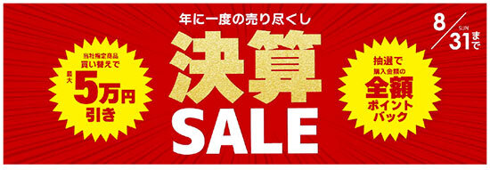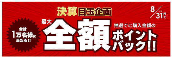 決算SALEでは、お買い得な決算特価商品を年に一度の売り尽くし価格で多く用意するとともに、指定商品への買い替えで最大5万円引きとなる買い替えキャンペーンも行う。さらに、目玉企画として抽選で計1万人に当たる、購入金額の最大全額(上限は10万円分)をポイントバックするキャンペーンも実施する。