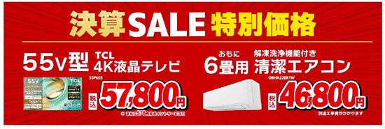 決算特価商品としては、TCLの55V型4K液晶テレビ「55P655」(販売価格は5万7800円)、ビックカメラのプライベートブランド「ORIGINAL」の6畳用エアコン「OBHA22BK1W」(販売価格は4万6800円。別途工事費が必要)などを用意している(いずれもなくなり次第終了)。