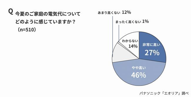 調査対象者に、今夏の家庭における電気代について尋ねたところ、「非常に高い」(27%)と「やや高い」(46%)を合わせた割合が73%を占めた。