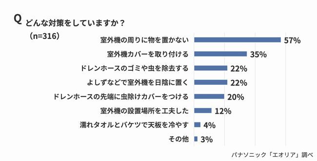 エアコンの室外機の節電対策について、「積極的に対策している」または「やや対策している」と答えた人に、具体的な対策内容を尋ねた質問(複数回答)では、「室外機の周りに物を置かない」(57%)がもっとも多く、「室外機カバーを取り付ける」(35%)、「ドレンホースのゴミや虫を除去する」「よしずなどで日陰に置く」(どちらも22%)がそれに続いた。