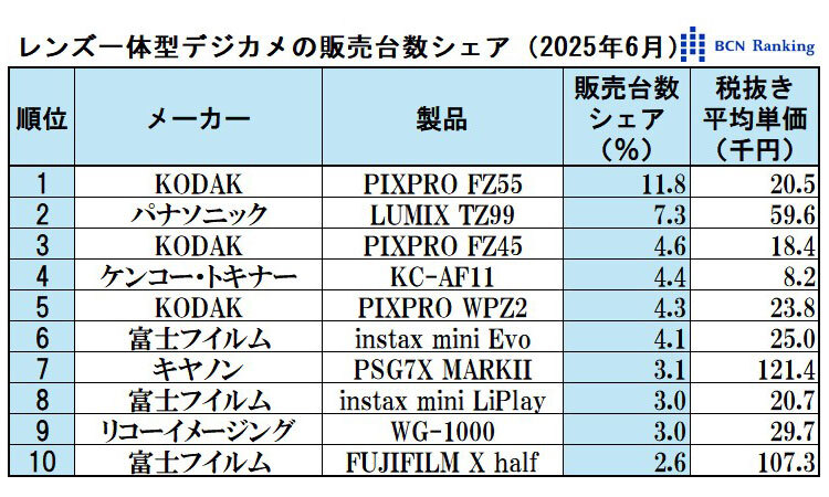 コンパクトカメラの販売ランキングを見ると、台数ランキングでは比較的安価な製品が上位に並び、金額ランキングでは、個性的なモデルが上位にランクインしている。この6月では、台数ランキング1位はKODAKの「PIXPRO FZ55」。2022年8月の発売以来、台数でTOP6以内に常駐している人気モデルだ。今年に入っても好調で、2月以降連続してトップシェアを維持している。6月の台数シェアは11.8%。1676万画素と普段使いには必要十分な撮像素子。光学ズームは28mm~140mm(35mmフィルムカメラ換算、以下同)と使い勝手がいい。それでいて6月の平均単価(税抜き、以下同)は2万500円。コンパクトカメラ全体の平均単価、3万8800円に比べると、かなりのお手頃価格だ。近頃激減している「ザ・コンパクトカメラ」といったデザインも人気の秘密だろう。