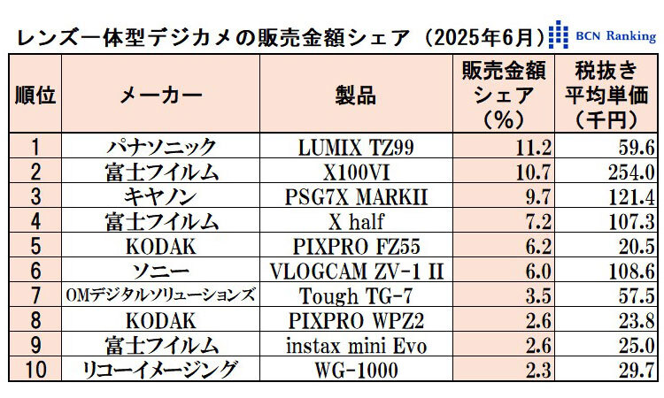 販売金額シェアでは、10.7%で2位の富士フイルム「X100VI」も目立っている。平均単価が25万4000円。コンパクトカメラの中ではとびぬけて高価だ。オーソドックスというより、レトロなデザインの本体が特徴。4020万画素と高画素数のAPS-C撮像素子を備えた本格派だ。レンズは35mmの短焦点で光学ズームなし。フィルムメーカーならではの豊富なフィルムシミュレーションモードを備える。アナログカメラに似た操作と画像を楽しめるのも持ち味だ。富士フイルムと言えば個性派ぞろい。6月に発売したばかりの「X half」も金額シェアでは7.2%で4位、台数シェアでも2.6%で10位につけている。35mmフィルムを縦に割って、縦位置で撮影する、昔のハーフサイズカメラを模したデジカメ。もちろん、売れに売れたデジタル版チェキとも言える「instax mini Evo」も台数6位、金額9位で健在だ。