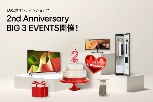 LGエレクトロニクス・ジャパンは8月5~17日23時59分の期間、LG公式オンラインショップのオープン2周年記念セールとして、「2nd Anniversary BIG 3 EVENTS」を開催する。
