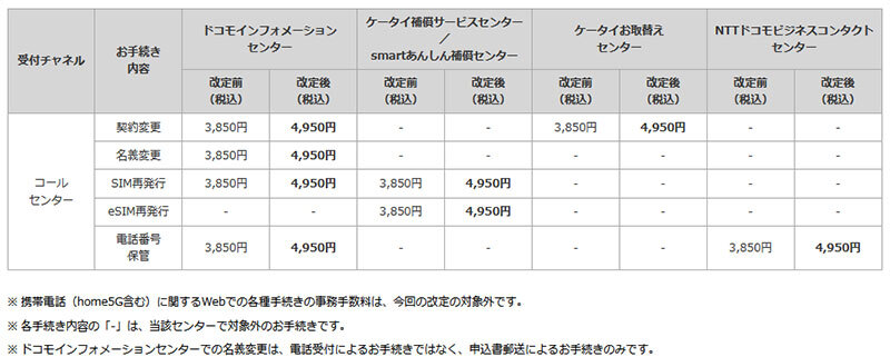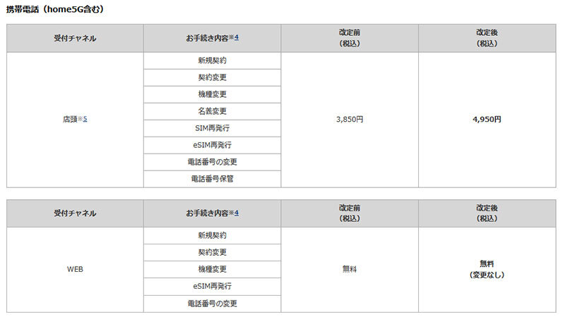 店頭チャネルでの携帯電話サービス(home5G含む)の新規契約・機種変更・名義変更・SIM再発行・eSIM再発行・電話番号変更・電話番号保管の事務手数料について、現在3850円のところ、4950円に値上げする。