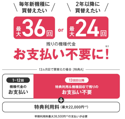 従来の「新トクするサポート(スタンダード)」は「特典利用料」の設定はなかったが、今回から「特典A・B」ともに設定。対象機種を購入した日が属する請求月を1カ月目として13~24カ月目に申し込むと最大36回分の端末代金の支払いが不要になる「特典A」の適用には、端末購入時から特典利用の申し込み完了までの「あんしん保証パック」への継続加入が条件となり、「特典利用料」に加えて「早期利用料」(スマートフォンの場合は最大3万8500円)の支払いが必要となる。