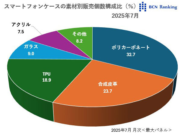 スマホケースの素材別に、この7月の販売個数を集計してみると、最も多かったのがポリカーボネイト製。32.7%を占めた。色は透明のものが最も多い。スマホ自体のデザインを生かしながら本体を守ることができ、しかも安価。人気の商品だ、次に多かったのが合成皮革を使った手帳タイプのケースで23.7%。仮に落としても、閉じた状態であれば、画面も本体も傷つくことは少ない。安心感がある。保護フィルムを組み合わせれば最強だ。ただ、スマホ本体が隠れてしまって、デザインの良さは楽しめない。これは大きなデメリットだ。私はこれまで手帳型ケース一辺倒だったが、複数のスマホを持ち歩くようになり、クリアケースも併用するようになった。さすがに手帳型を二つを持ち歩くとかさばるので、メインスマホを手帳型、サブスマホはクリアケースにしている。しばらく使っているが、クリアケースならあまりかさばらず、ガラスフィルムを貼っておけば、画面も本体もある程度保護できる。