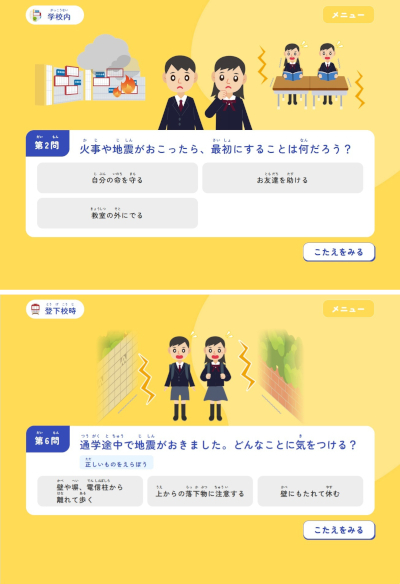 日常生活の中で直面しうる状況を想定し、「学校内」「登下校時」「自宅」の三つの場面ごとに、知っておきたい防災知識がQ&A形式で出題される。問題に回答すると、すぐに解説とポイントが表示されるので、正しい知識をその場で身につけられる。また、繰り返し学習することによって、知識の定着を図れる。